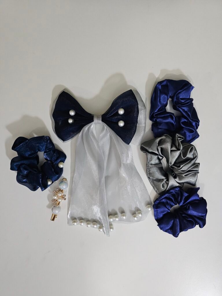 This cute hair accessories combo set includes a stylish satin bow clip and soft fabric scrunchies. Designed to be gentle on hair and comfortable to wear, it is perfect for everyday use, parties, and special occasions.