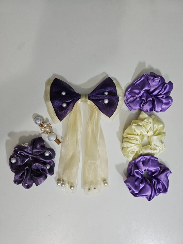 This cute hair accessories combo set includes a stylish satin bow clip and soft fabric scrunchies. Designed to be gentle on hair and comfortable to wear, it is perfect for everyday use, parties, and special occasions.