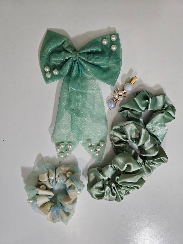 This cute hair accessories combo set includes a stylish satin bow clip and soft fabric scrunchies. Designed to be gentle on hair and comfortable to wear, it is perfect for everyday use, parties, and special occasions.