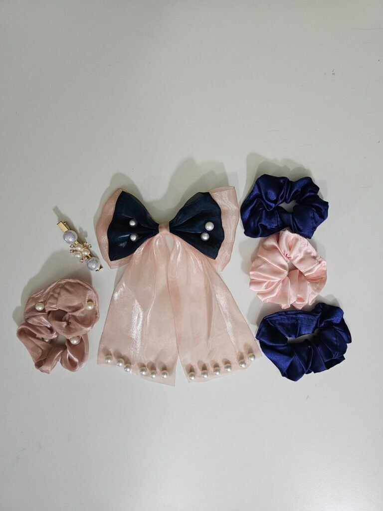 This cute hair accessories combo set includes a stylish satin bow clip and soft fabric scrunchies. Designed to be gentle on hair and comfortable to wear, it is perfect for everyday use, parties, and special occasions.