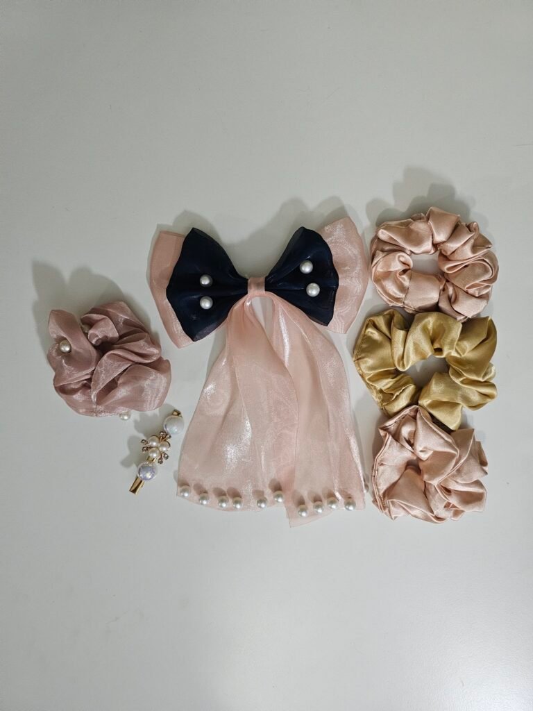 This cute hair accessories combo set includes a stylish satin bow clip and soft fabric scrunchies. Designed to be gentle on hair and comfortable to wear, it is perfect for everyday use, parties, and special occasions.