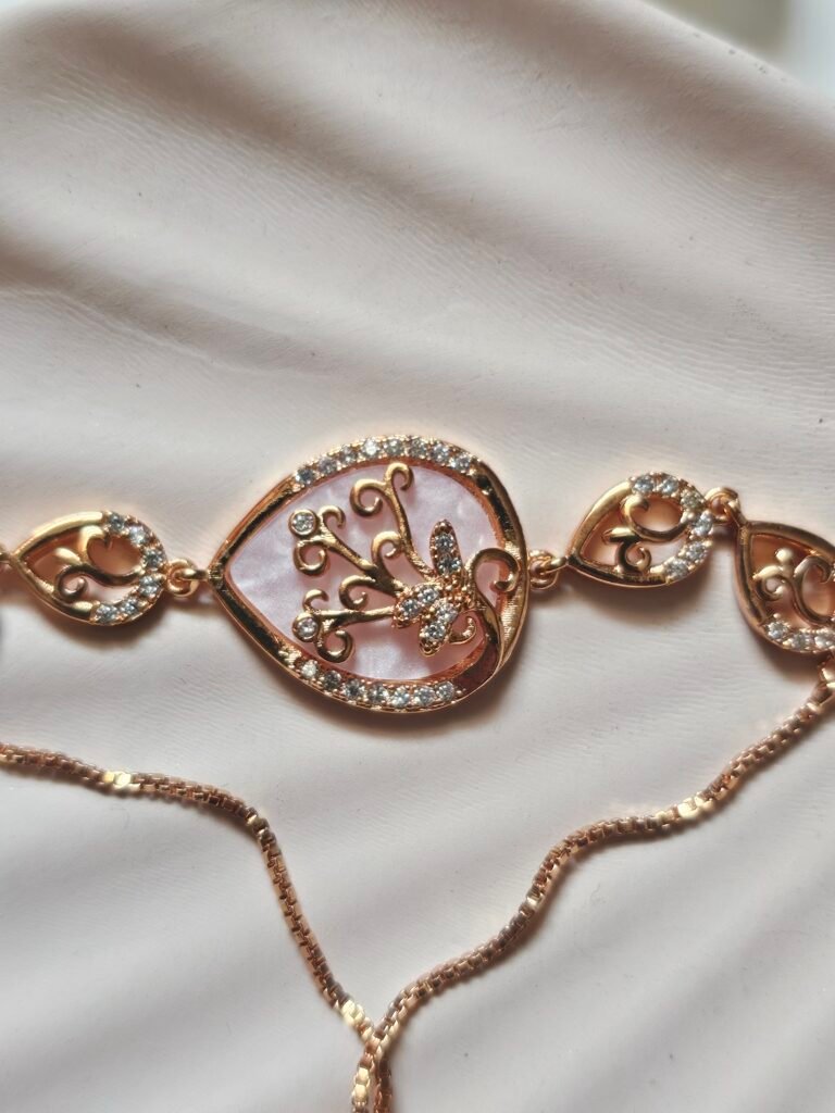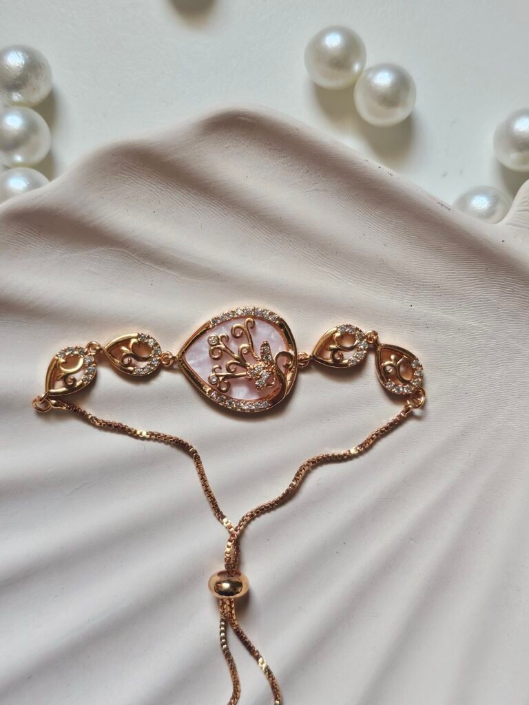 A delicate bracelet featuring a soft baby pink stone set on a beautiful gold chain. Designed to add a subtle and elegant touch to your style.